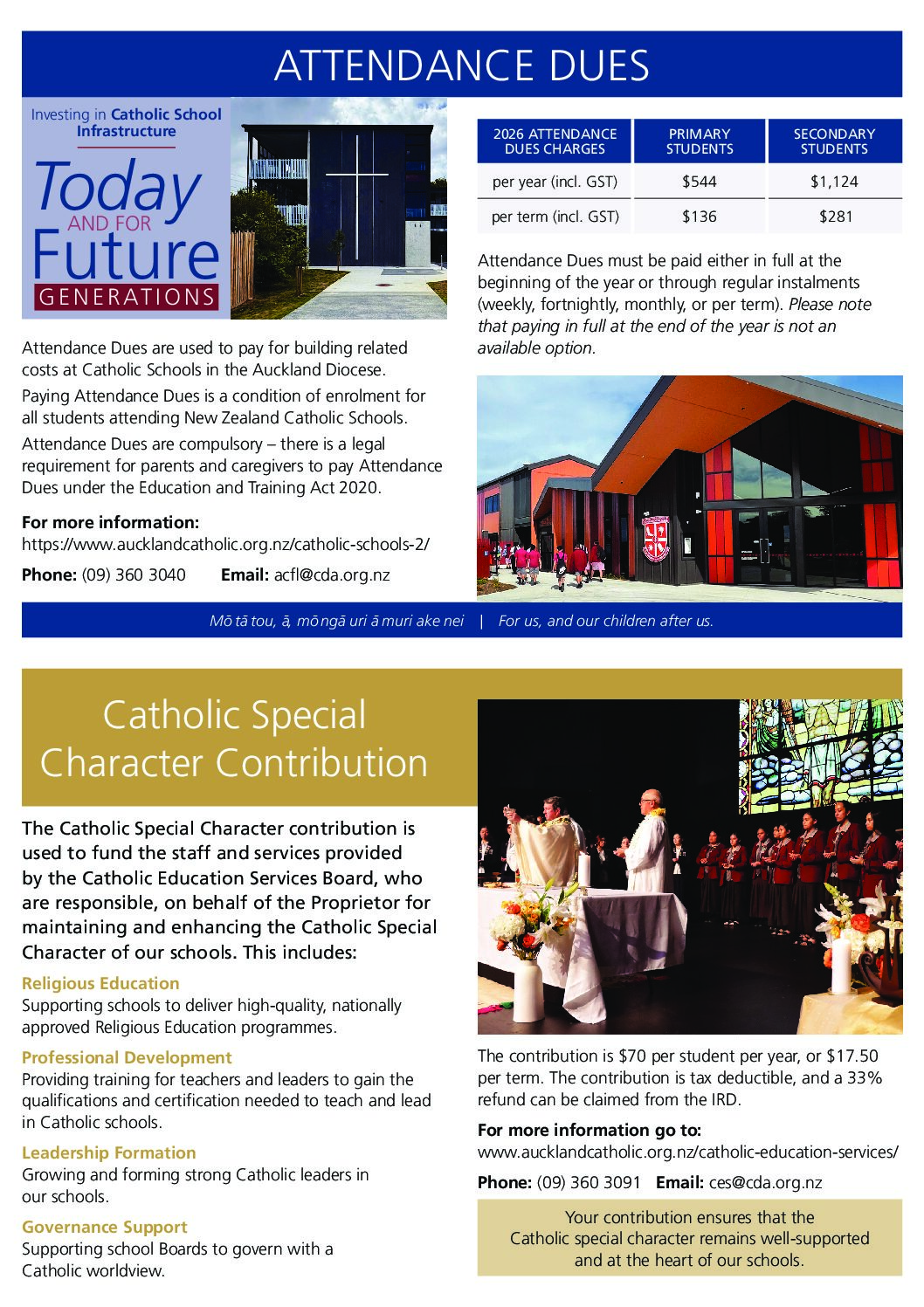 Families facing financial difficulties can contact their school office, their Parish Priest, or Auckland Common Fund Ltd at the Catholic Diocese of Auckland on 09 360 3040 for further information.